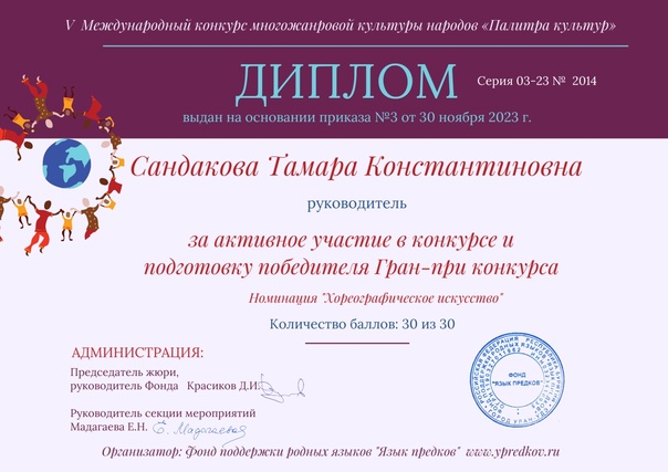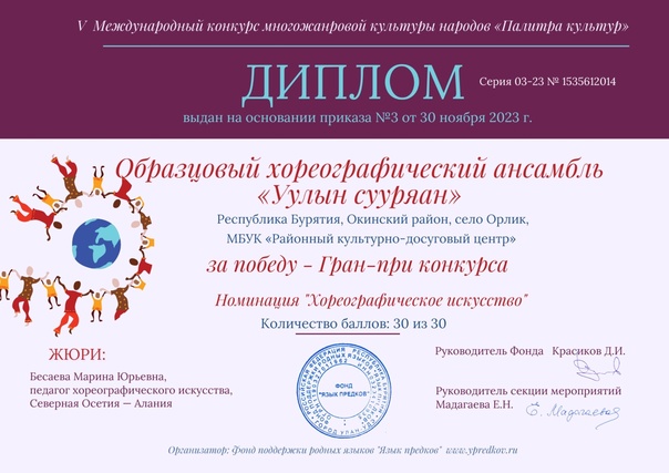 С 5 октября по 13 ноября проводился V-ый Международный конкурс многожанровой культуры народов «Палитра культур» (заочная форма участия), где образцовый хореографический ансамбль «Уулын сууряан» удостоился Гран-При конкурса в номинации — народные танцы, категория —