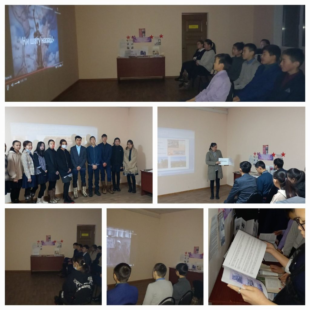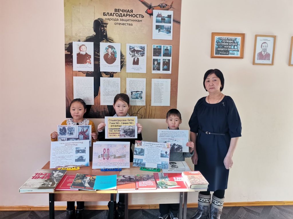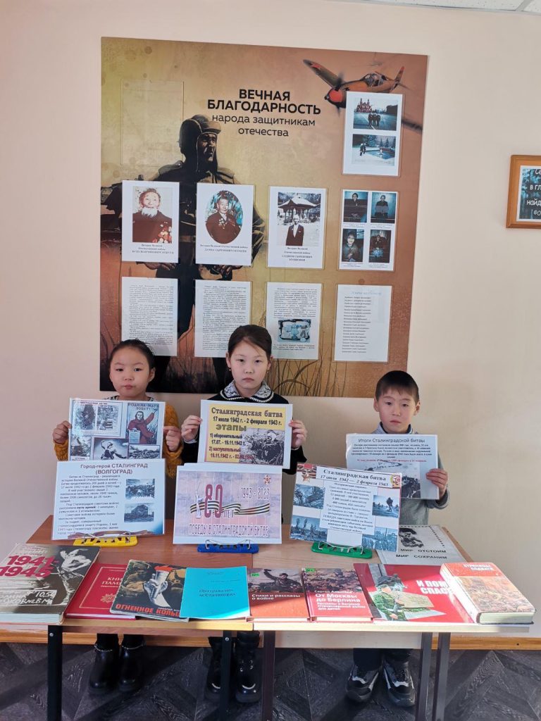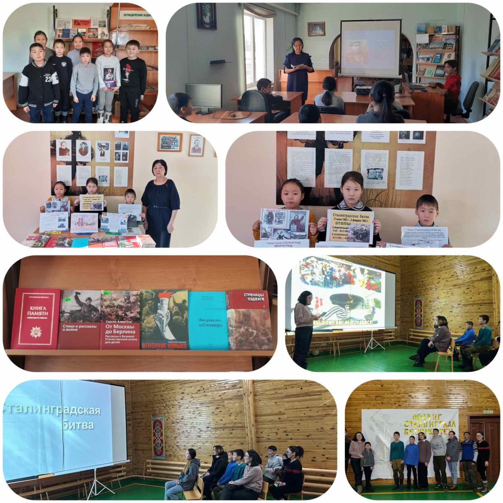 Заведующая Балактинской сельской библиотеки провела выездное мероприятие – урок мужества. На мероприятии была представлена презентация «Битва за Сталинград». Сотрудниками Сорокского СДК и библиотеки для старшеклассников проведен урок мужества «Подвиг на века». В Хара-Хужирской начальной школе заведующая сельской библиотеки Т.Ч. Габанова провела информационный урок «Сталинградская битва» и обзор книжной выставки «80 лет Победы в Сталинградской битве». Дети внимательно слушали об ожесточённых боях, обороне Дома Павлова, которая длилась 58 дней, Мамаевом кургане, славе города-героя Сталинграда. В Бурунгольском поселении для учащихся 3-4 классов библиотекарем Хужирской сельской библиотеки О.Ш. Папаевой был проведен урок мужества «Мужество Сталинграда». Также в клубе была представлена видеопрезентация «Сталинградская битва: 200 дней, 200 ночей».