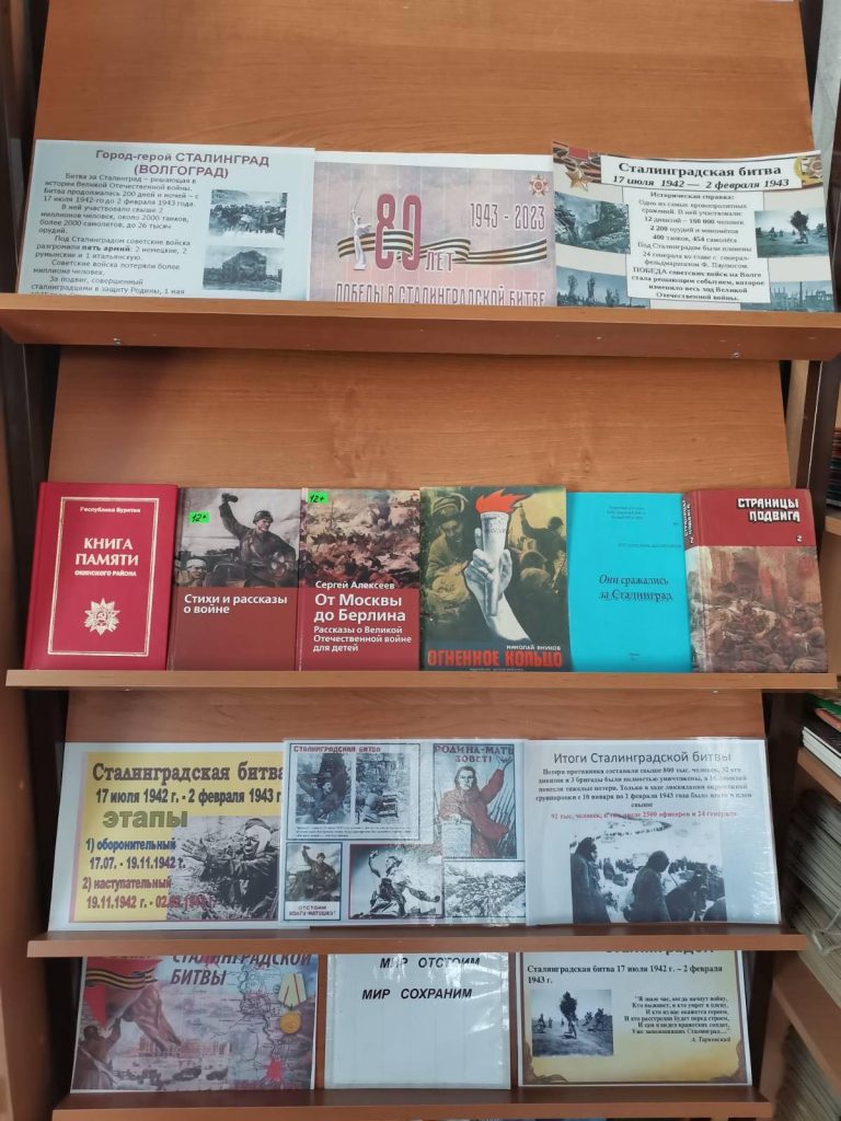 80 лет назад, 2 февраля, советские войска одержали победу над немецко-фашистскими захватчиками в Сталинградской битве. Благодаря мужеству советских солдат, руководству командиров именно под Сталинградом планы гитлеровской коалиции окончательно провалились. В памятные дни воинской славы учреждениями культуры были организованы уроки мужества, оформлены книжные выставки, показаны видеопрезентации в память о мужестве воинов, победивших в Сталинградской битве.